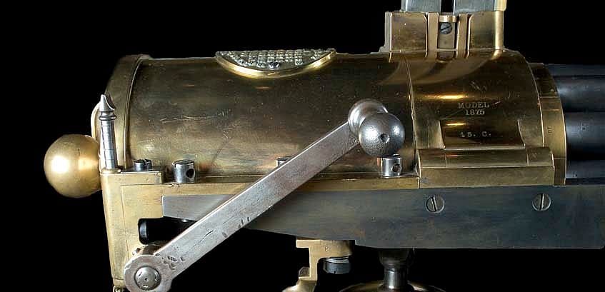 Close-up of the U.S. Model 1875 Gatling Gun, a significant piece of military history, showcasing its detailed mechanics and brass finish.