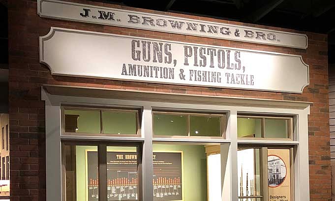 Recreation of John Moses Browning's workshop displaying a historic storefront with signage for guns, pistols, ammunition, and fishing tackle.