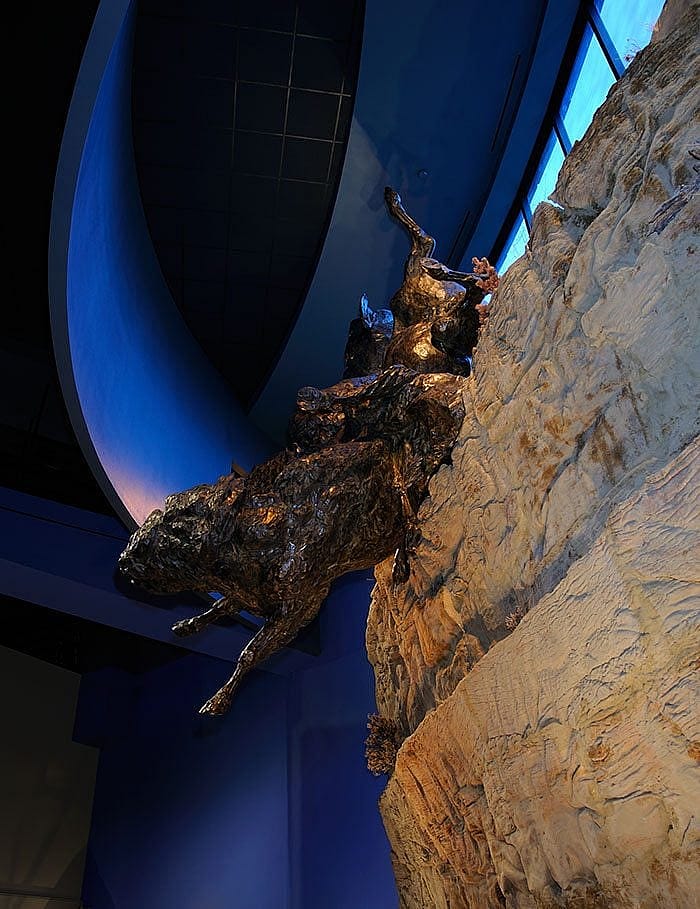 As many as 30-60 million bison once lived in North America. Plains Indians relied on these bison for food, shelter, and supplies. One hunting method of the Plains Indians was to drive them over a carefully chosen cliff, as shown in this contemporary sculpture.