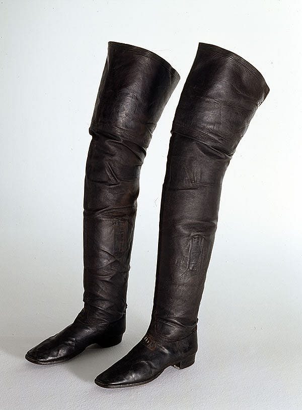 Pair of tall, black leather boots worn by Buffalo Bill during his performances, showcasing intricate craftsmanship and historical significance.