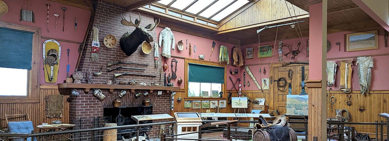 Re-creation of Frederic Remington's studio, displaying an array of his personal items, artwork tools, and Western memorabilia against a rustic backdrop.