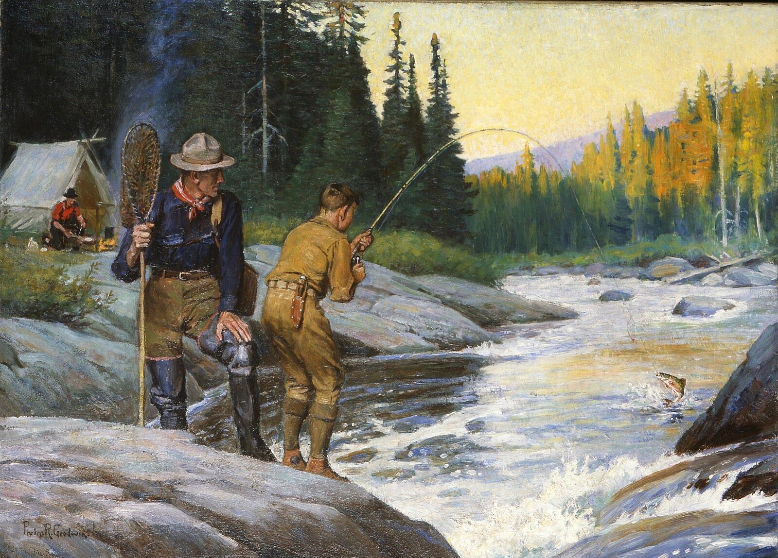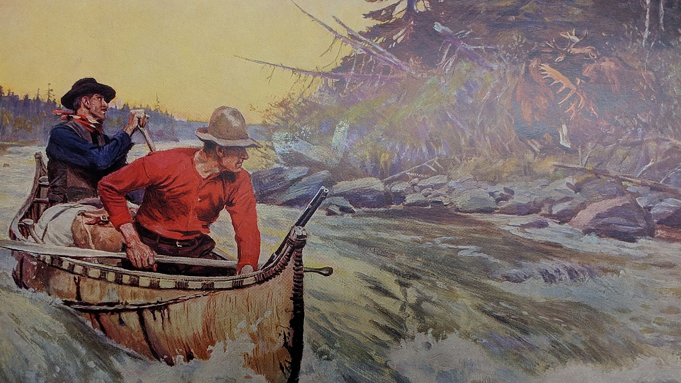 When I gave an early version of this talk at a gathering of Wyoming game wardens, I showed them a Goodwin painting featuring two canoeists being confronted by a mountain lion. I asked them if they or any of their friends had ever seen a mountain lion perched on a log over a stream as they paddled by (the answer was no.) As his career went on, Goodwin’s work became increasingly focused on predicament scenes which are somewhat unrealistic.