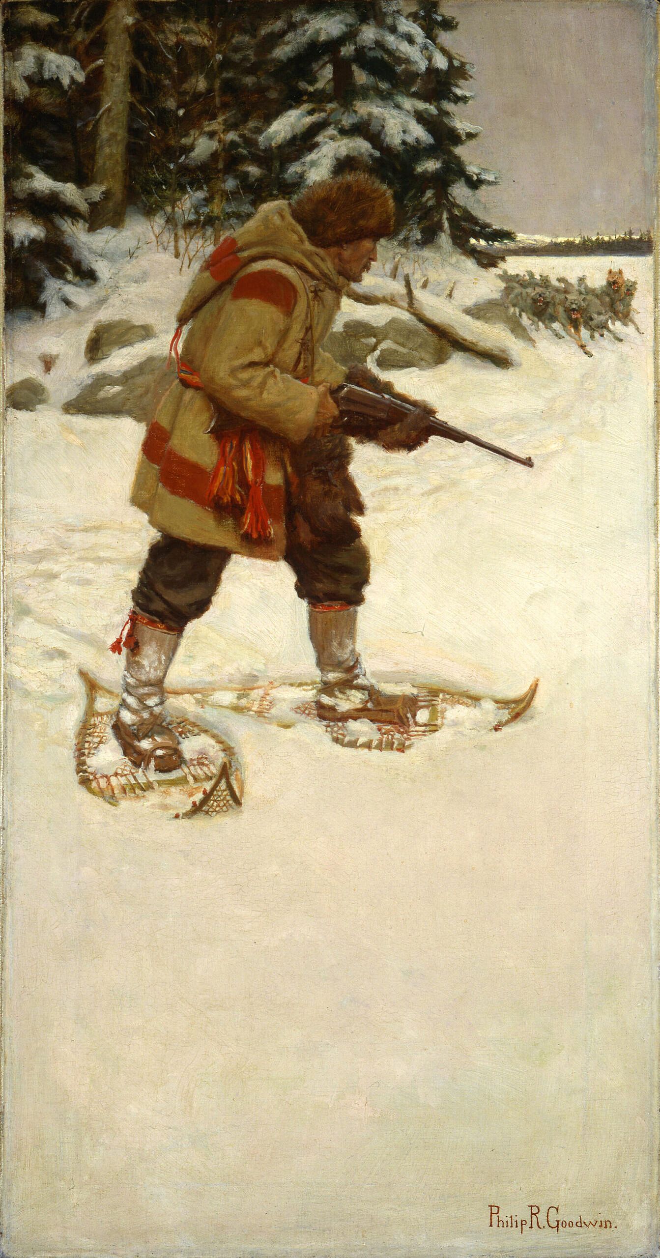 The book was renamed The Call of the Wild, and it made Jack London an international celebrity. It was Philip R. Goodwin’s big break. From this point on, Goodwin was in demand. Calendars, outdoor equipment companies, and magazine jobs all flowed; most notably, Theodore Roosevelt chose Goodwin over peers like Charles M. Russell and Carl Rungius to illustrate African Game Trails. Possessed of an intense work ethic, Goodwin worked six days a week at his studio, taking Sundays only to paddle his canoe on Long Island Sound.
