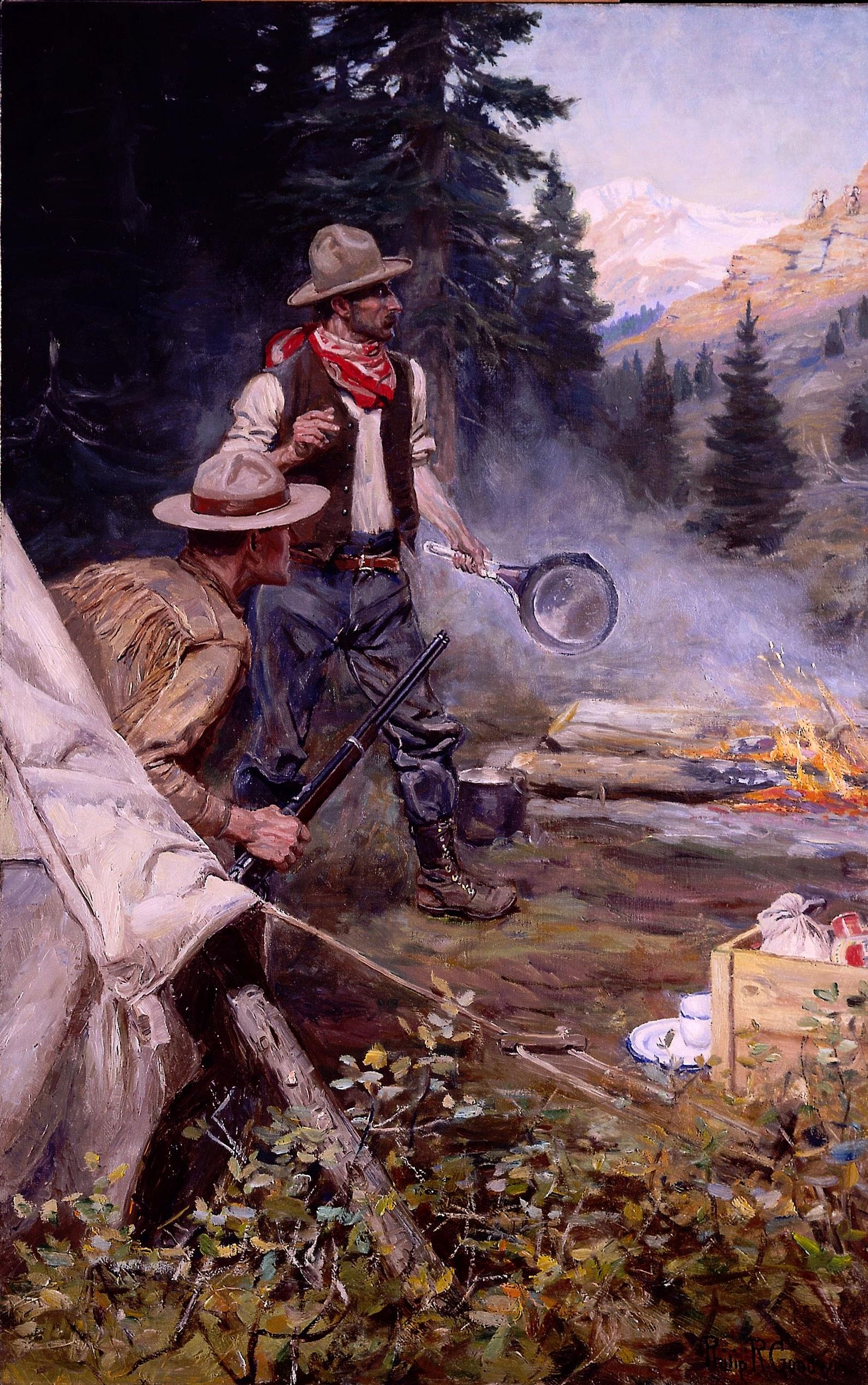 Goodwin used the North Woods scenery of Maine for this “predicament” painting. Philip R. Goodwin (1881 – 1935). The Law of the Wilderness.  Image courtesy of the Coeur d’Alene Art Auction. Used by permission for educational purposes only.