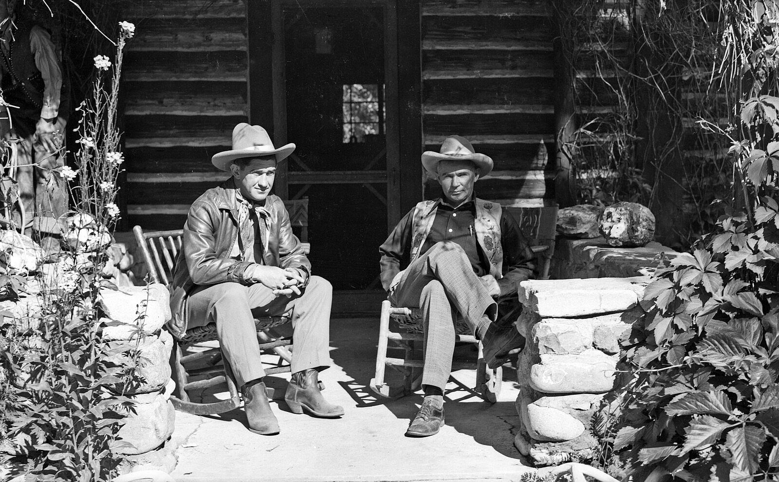 Mickey Cochrane (left) and Max Wilde relax on the porch of Max’s Lazy Bar F Ranch, during the middle of baseball season. McCracken Research Library.