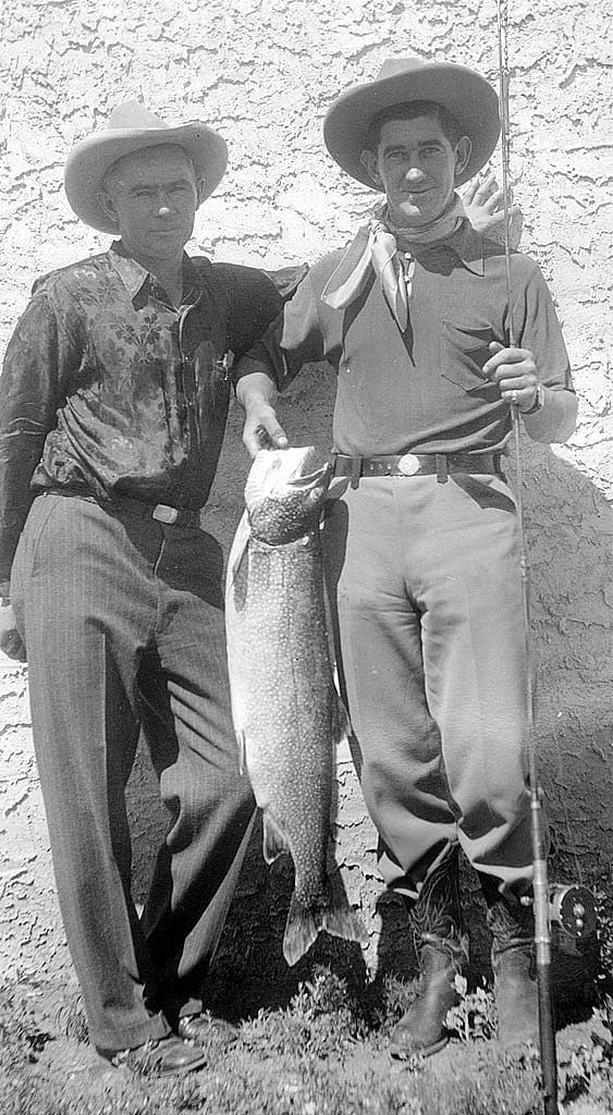 Max and Mickey dropped by the taxidermy shop to show off this big trout. McCracken Research Library.