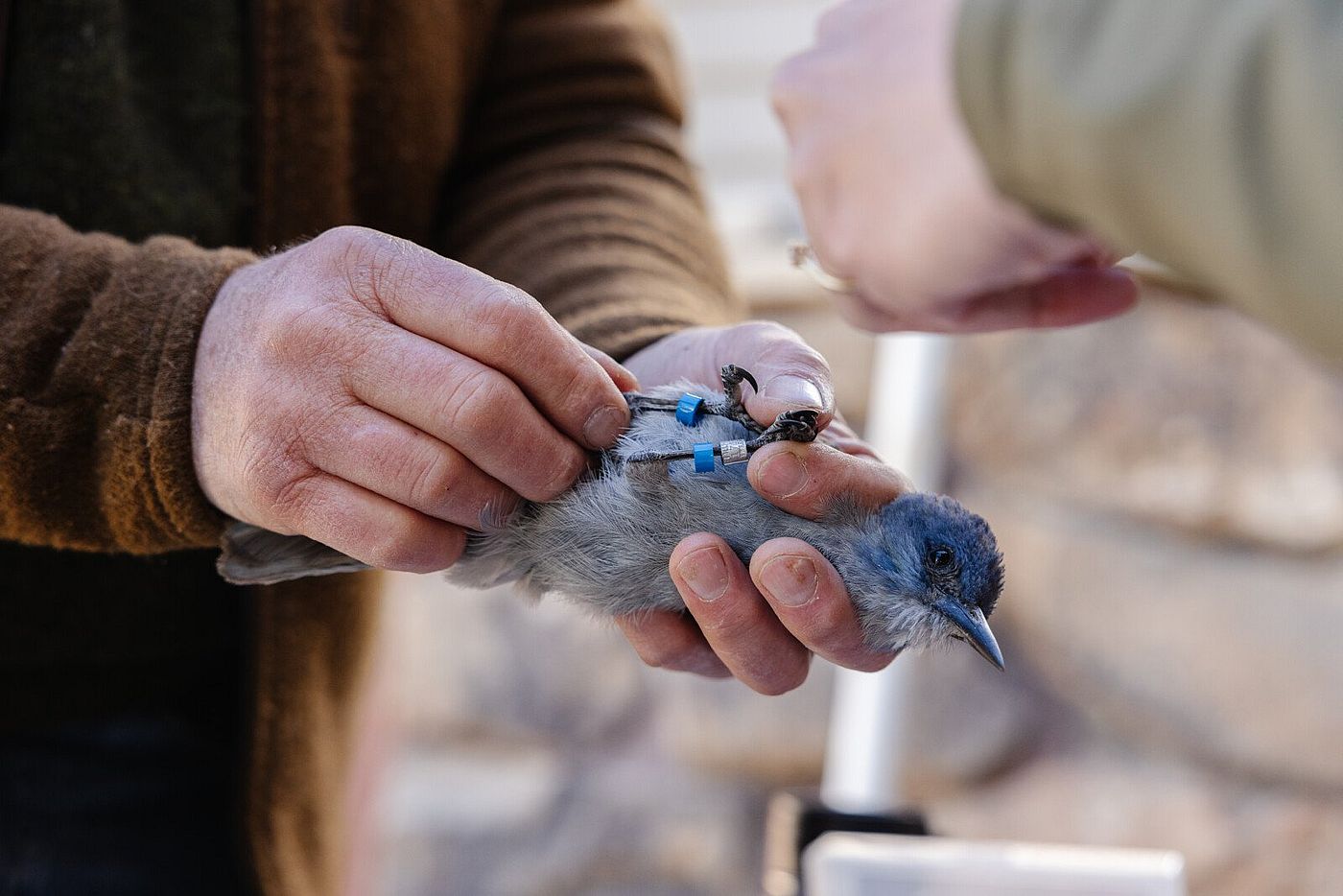 The jays were each banded with both USGS aluminum bands and up to three colored plastic ones. These bands are placed around a bird’s legs and are arranged in different patterns to make the individuals easier to tell apart.