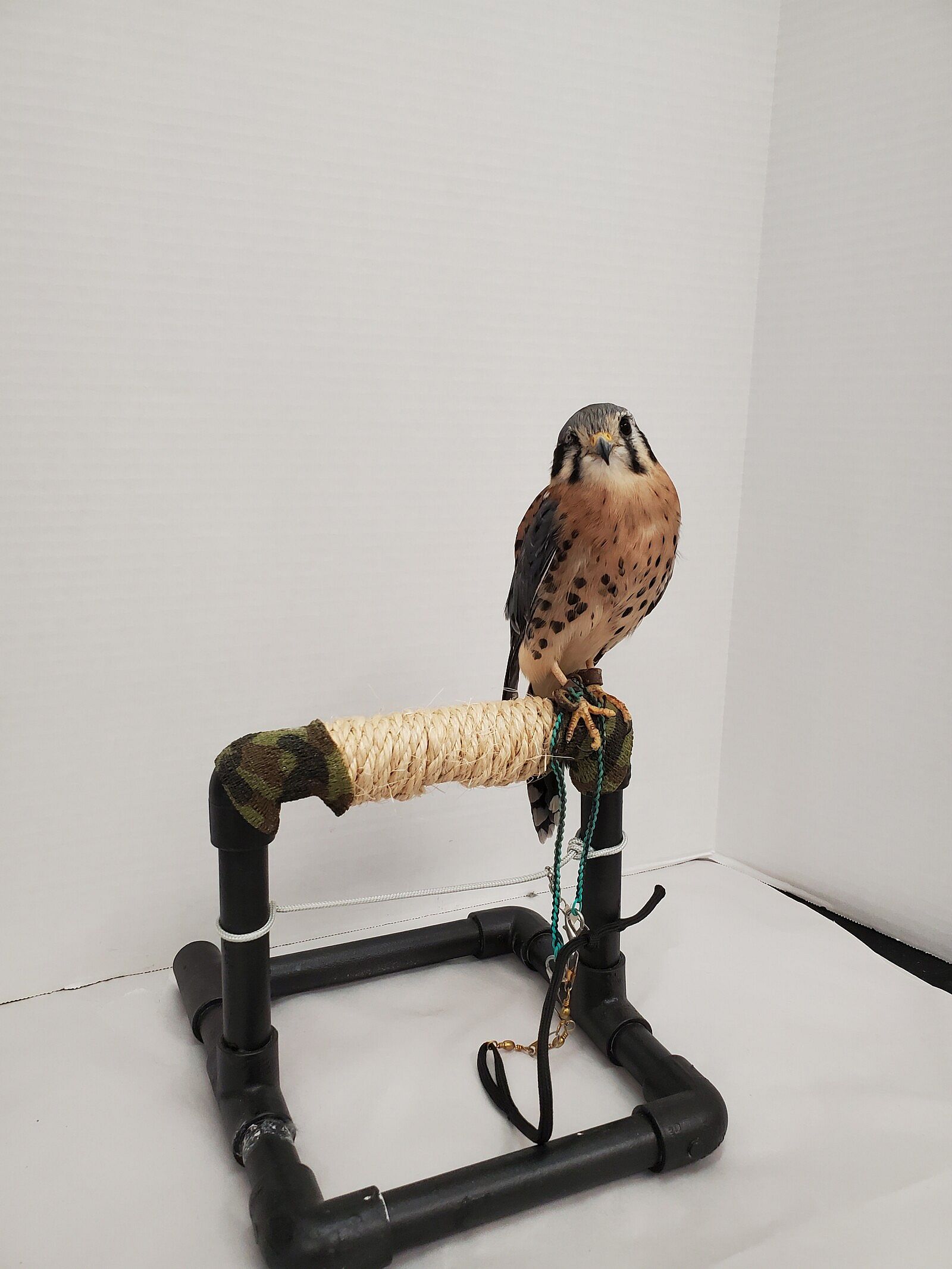 During virtual programs, Salem, an American Kestrel, is tethered to a perch with jesses and a leash for his safety.