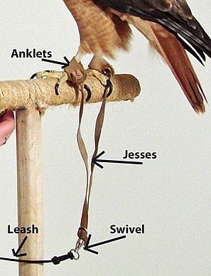 Keeping the birds comfortable and safe on the glove require several pieces of equipment specifically for them. The two most important pieces for them include: anklets and jesses.