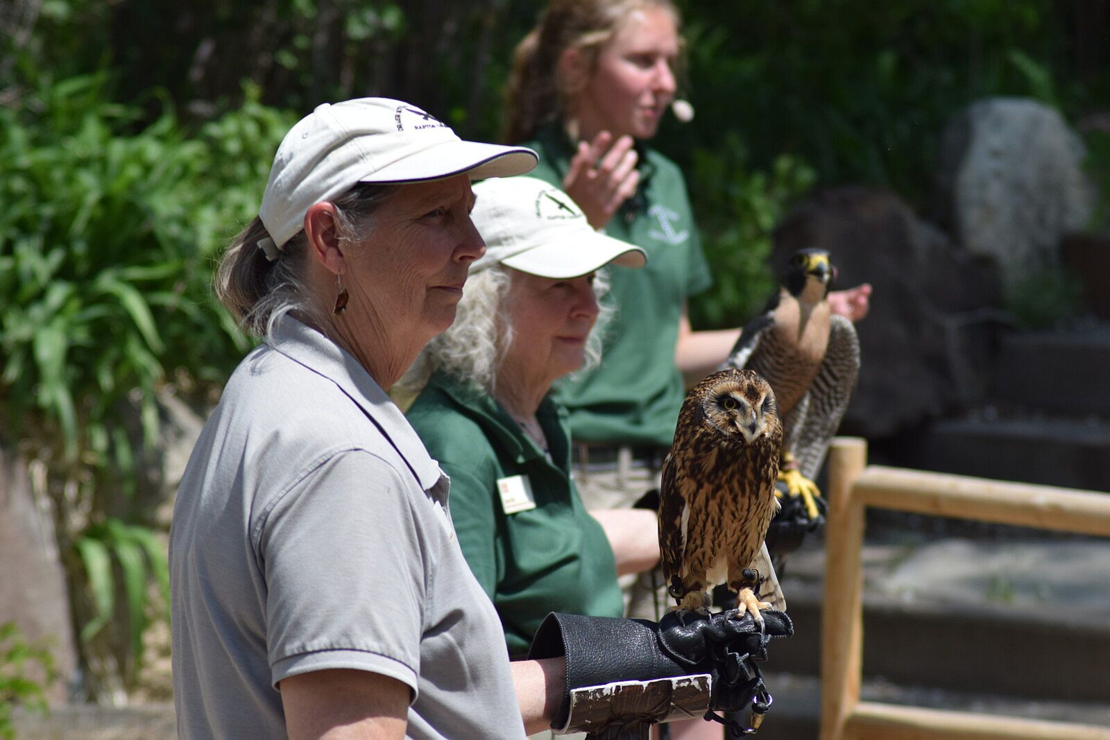 Raptor Experience volunteer, Sally Disque, uses a small glove to hold Amelia, a short-eared owl.