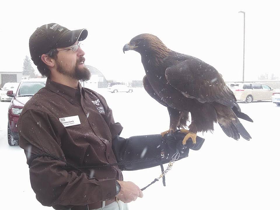 Brandon Lewis, Live Raptor Husbandry and Training Specialist, handles Kateri, the Golden Eagle, using the long glove with a special sheath over it to protect against her long talons.
